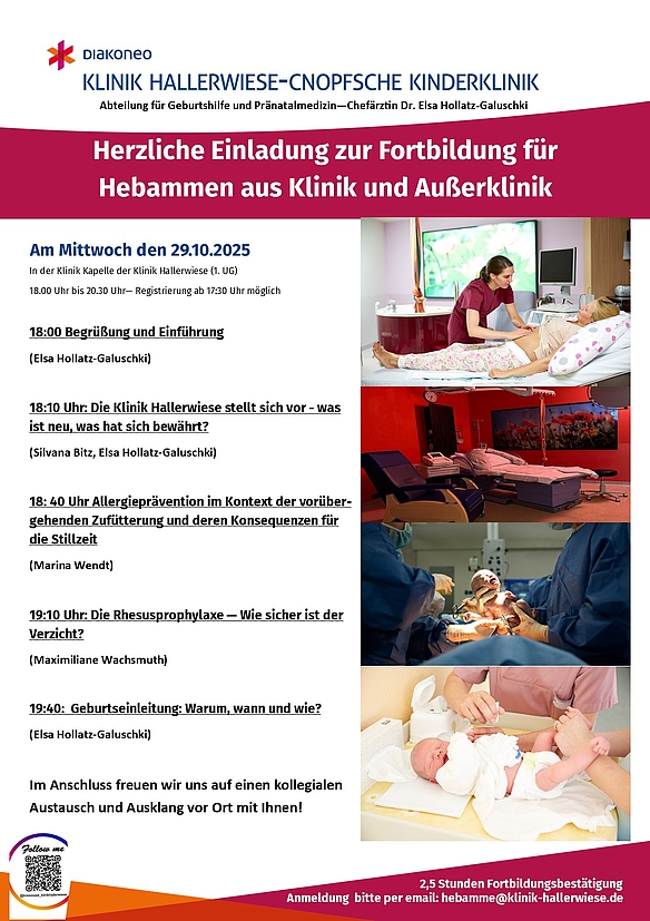 Am 29.10.25 findet in der Kapelle der Klinik Hallerwiese von 18:00 bis 20:30 Uhr eine Fortbildung für Hebammen statt.
